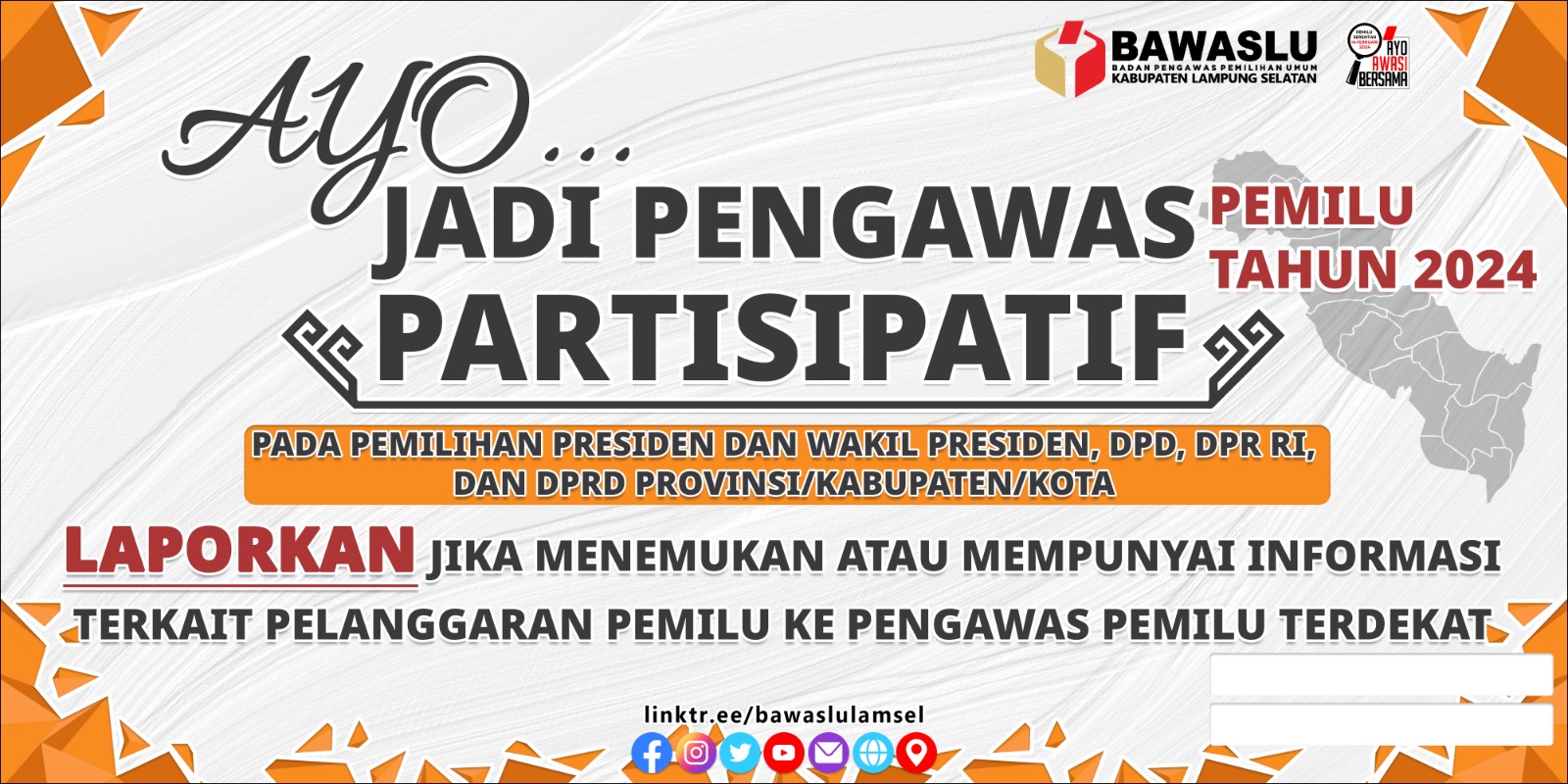Ayo jadi pengawas partisipatif untuk pemilu tahun 2024 pada pemilihan presiden dan wakil presiden, DPD, DPR RI dan DPRD Provinsi dan DPRD Kabupaten/Kota.