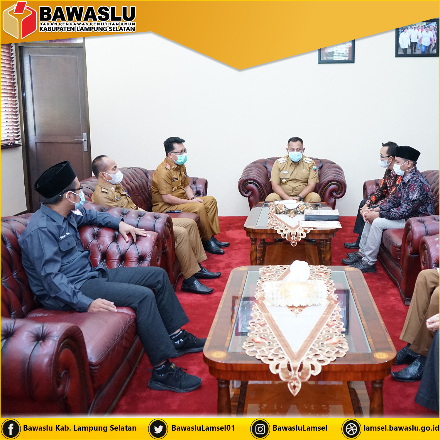 Hendra Fauzi selaku Ketua Bawaslu Kabupaten Lampung Selatan menyerahkan secara langsung Laporan tersebut kepada Bupati Lampung Selatan H. Nanang Ermanto dengan didampingi oleh Anggota Bawaslu Kabupaten Lampung Selatan Iwan Hidayat, Fakhrur Rozi, serta Korsek dan BPP yaitu Erlina dan Deni Afero.