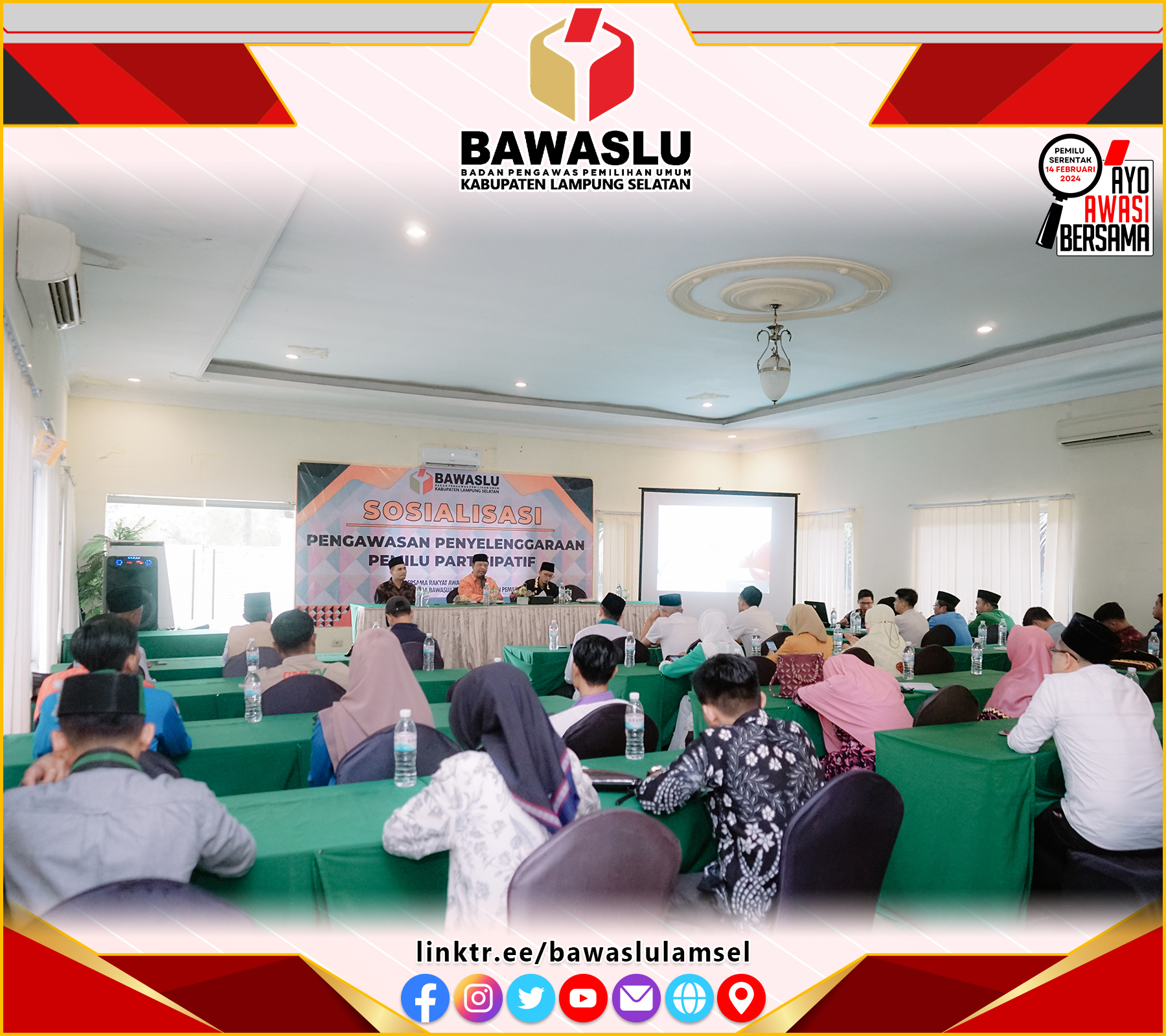 Kalianda - Pendidikan politik terus digaungkan, pendidikan politik kepada masyarakat untuk memberikan pengetahuan, keterampilan dan pemahaman mengenai persoalan politik. Oleh dasar tersebut Bawaslu Kabupaten Lampung Selatan mengadakan kegiatan Sosialisasi Pengawasan Partisipatif Pemilu Serentak Tahun 2024 di Hotel Negeri Baru Resort Kalianda Kamis (29/09).