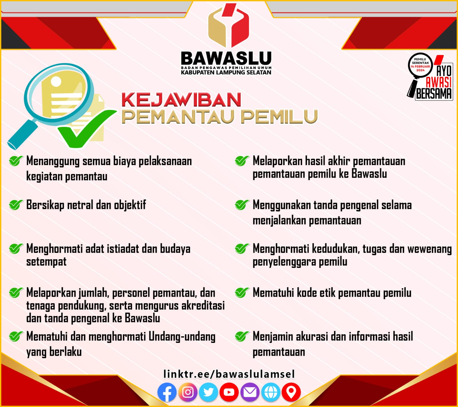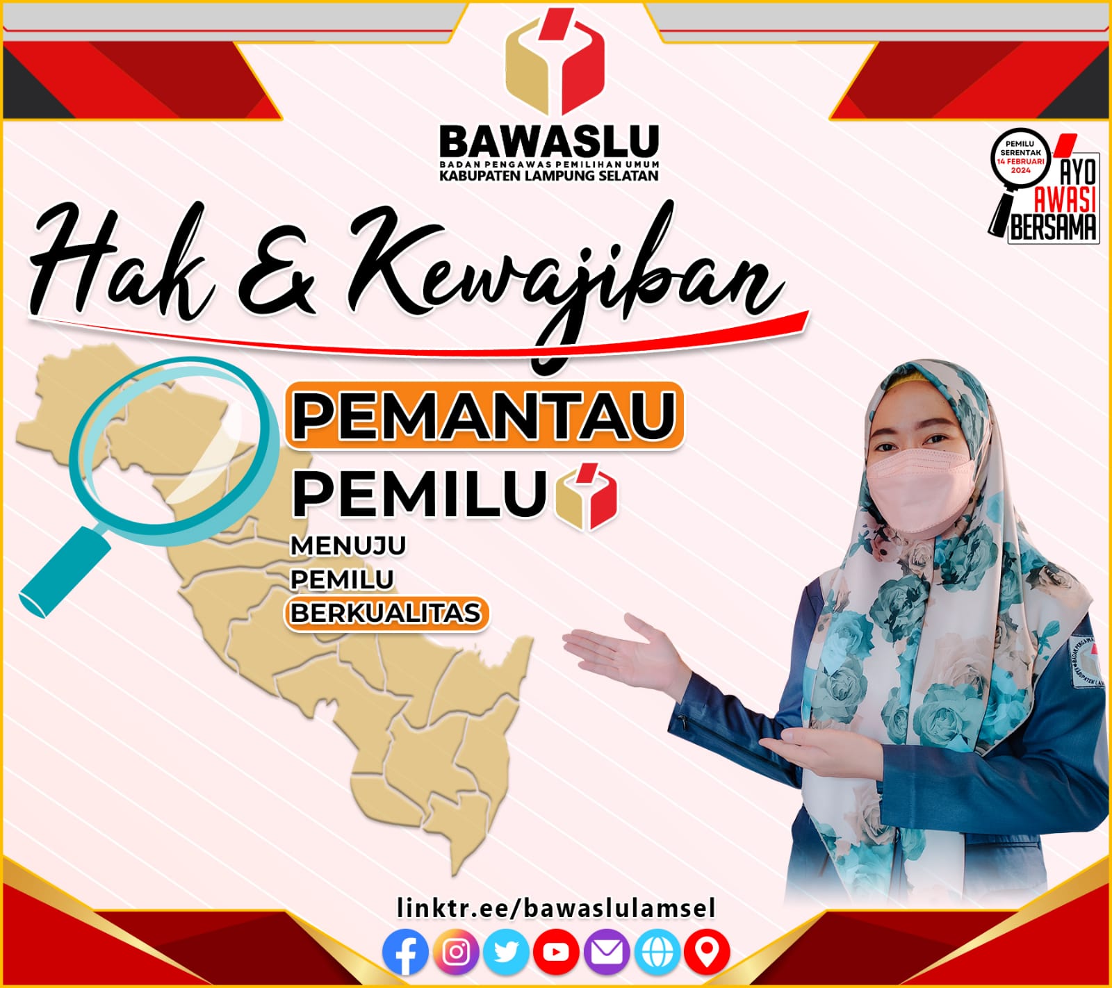 Bawaslu Lampung Selatan membuka pendaftaran Lembaga Pemantau Pemilu 2024 yang ditandai dengan penyediaan Meja Layanan Pemantau Pemilu 2024. Selain untuk menerima pendaftaran Pemantau Pemilu 2024, Meja Layanan Pemantau Pemilu 2024 juga akan menjadi sarana yang melayani pemantau Pemilu 2024 dalam melaksanakan tugas pemantauan pemilu, terutama yang berhubungan dengan Bawaslu sebagaimana yang telah diatur dalam peraturan perundang-undangan. Meja Layanan Pemantau Pemilu 2024 penting untuk mempermudah komunikasi antara Bawaslu dengan pemantau pemilu yang merupakan mitra kerja strategis Bawaslu.
