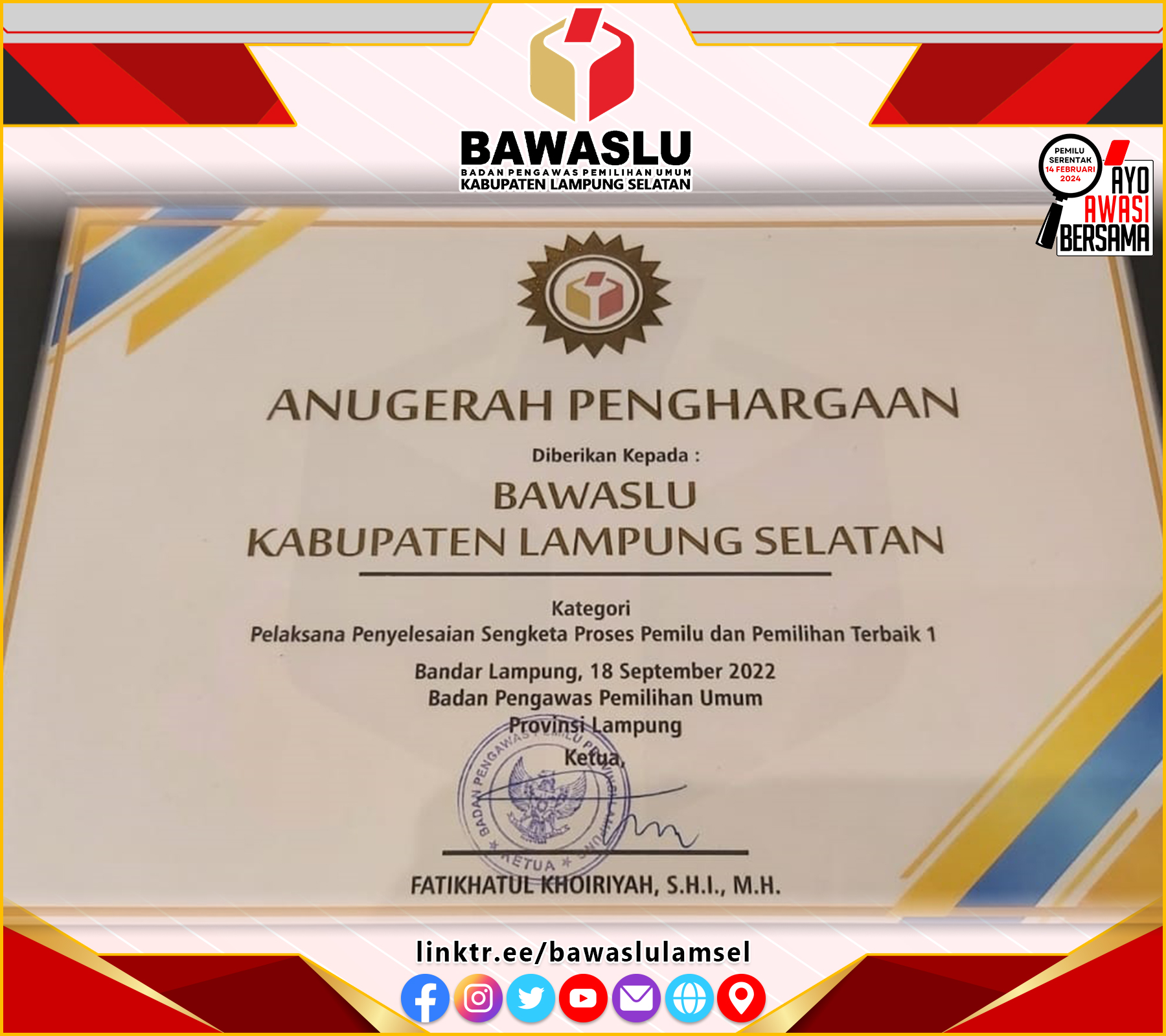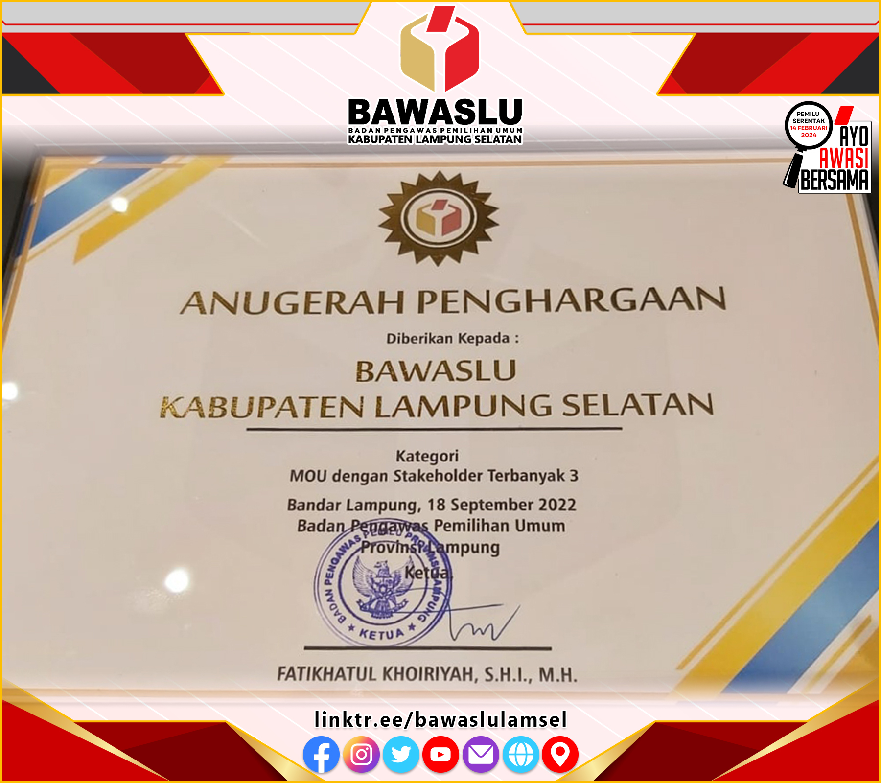 Bawaslu Kabupaten Lampung Selatan yang sebelumnya telah mendapatkan dua penghargaan dari Bawaslu Provinsi Lampung diantaranya :