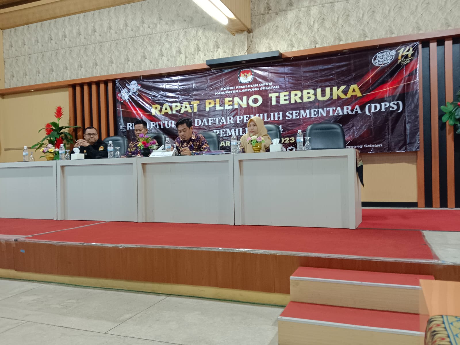 Badan Pengawasan Pemilihan Umum (Bawaslu) Kabupaten Lampung Selatan (Lamsel) hadiri undangan rapat pleno terbuka Komisi Pemilihan Umum (KPU) terkait pleno penetapan DaftarPemilih Sementara (DPS) yang dilaksanakan Selatan di Hotel Radin Inten Natar pada Rabu5/4/2023.
