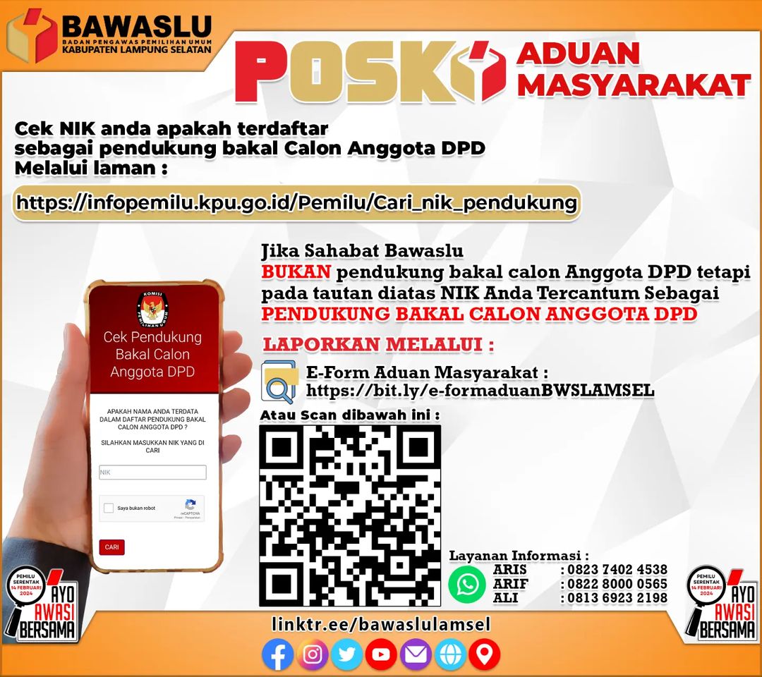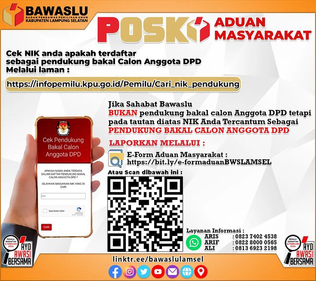 Bawaslu Lamsel membuka Posko Aduan Masyarakat Jika NIK Anda Terdaftar Sebagai Pendukung Balon Anggota DPD, Begini Caranya.