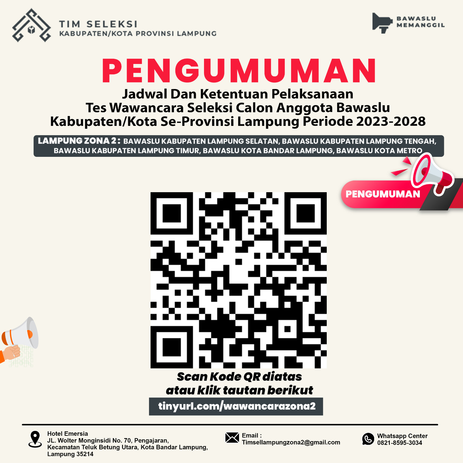 Berikut disampaikan Jadwal dan Ketentuan Tes Wawancara Seleksi Anggota Bawaslu Kabupaten/Kota se-Provinsi Lampung Masa Jabatan 2023 - 2028 Zona 2 Lampung :