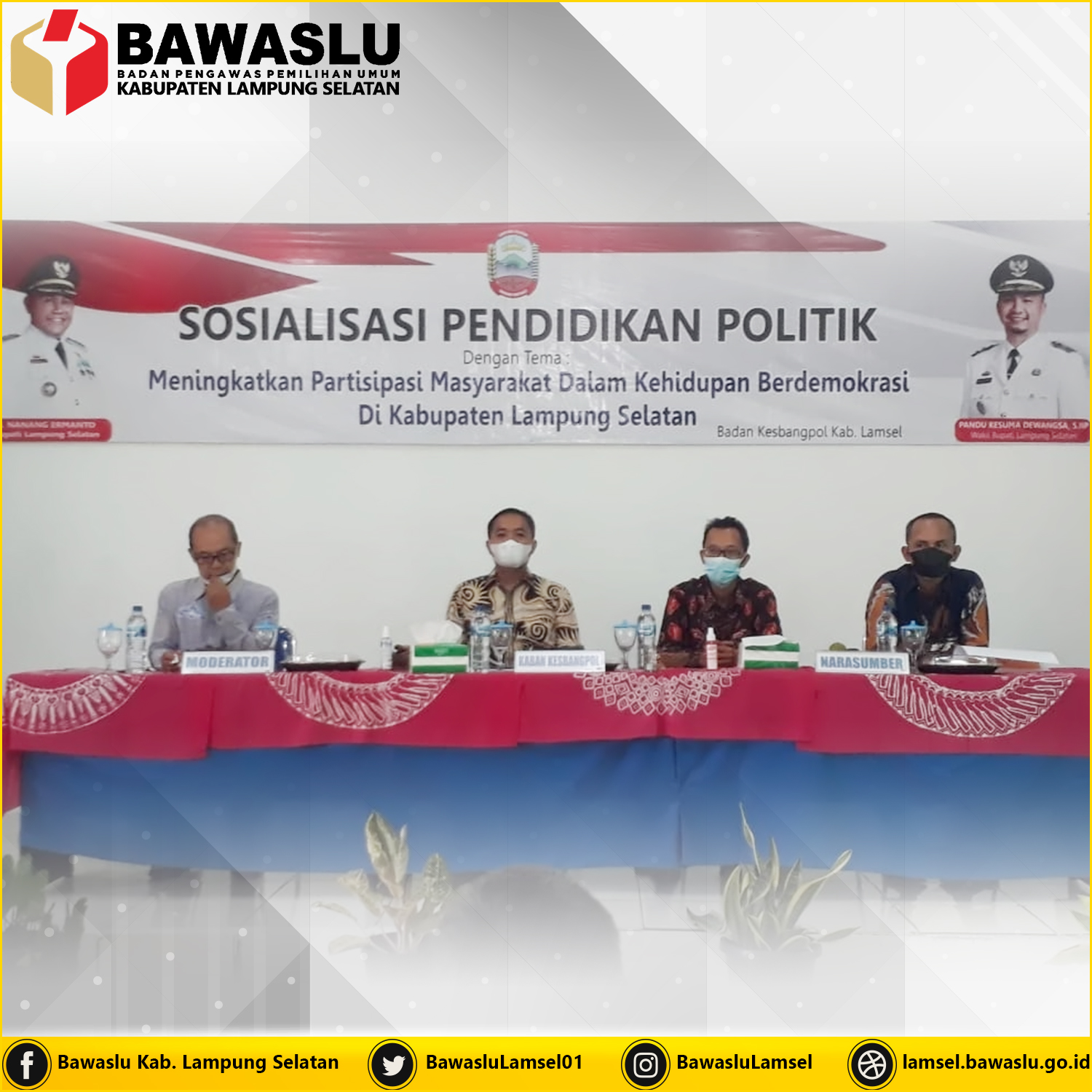 Kegiatan tersebut berlangsung selama dua hari, pada tanggal 30 September 2021 dan 04 Oktober 2021 yang dubuka oleh Kepala Kesbangpol Lamsel Thomas Amirico, dan dihadiri juga oleh Anggota Komisi Pemilihan Umum Kabupaten Lampung Selatan Mislamuddin yang juga sebagai narasumber, dengan Peserta Perangkat Desa, Tokoh Masyarakat, Tokoh Agama, dan Tokoh Adat.