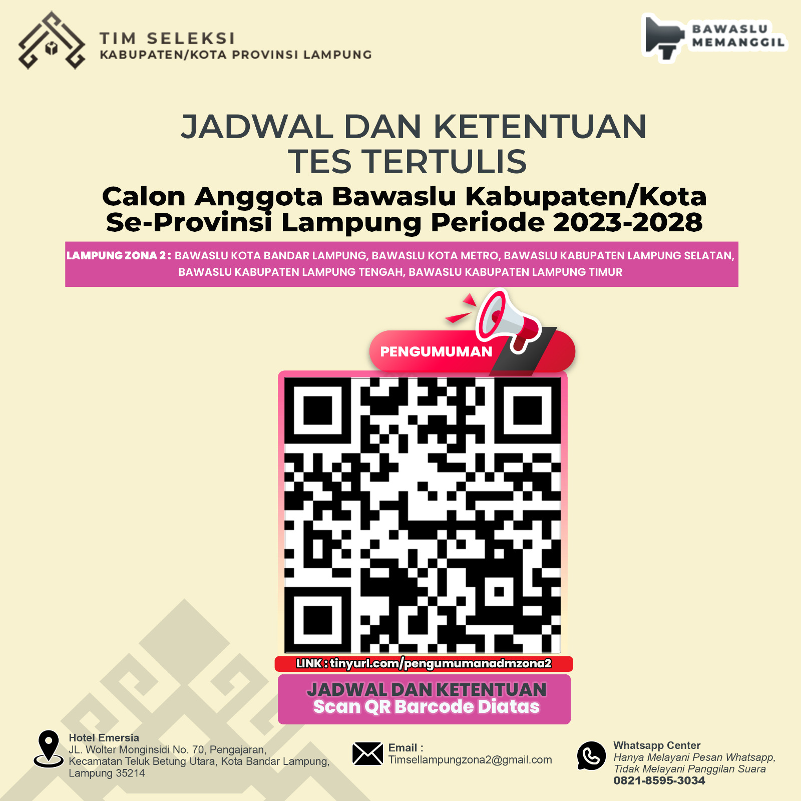 Pengumuman, Jadwal dan Ketentuan Tes Tertulis Calon Anggota Bawaslu Kabupaten/Kota Se-Provinsi Lampung Masa Jabatan 2023 - 2028 Zona 2 Lampung