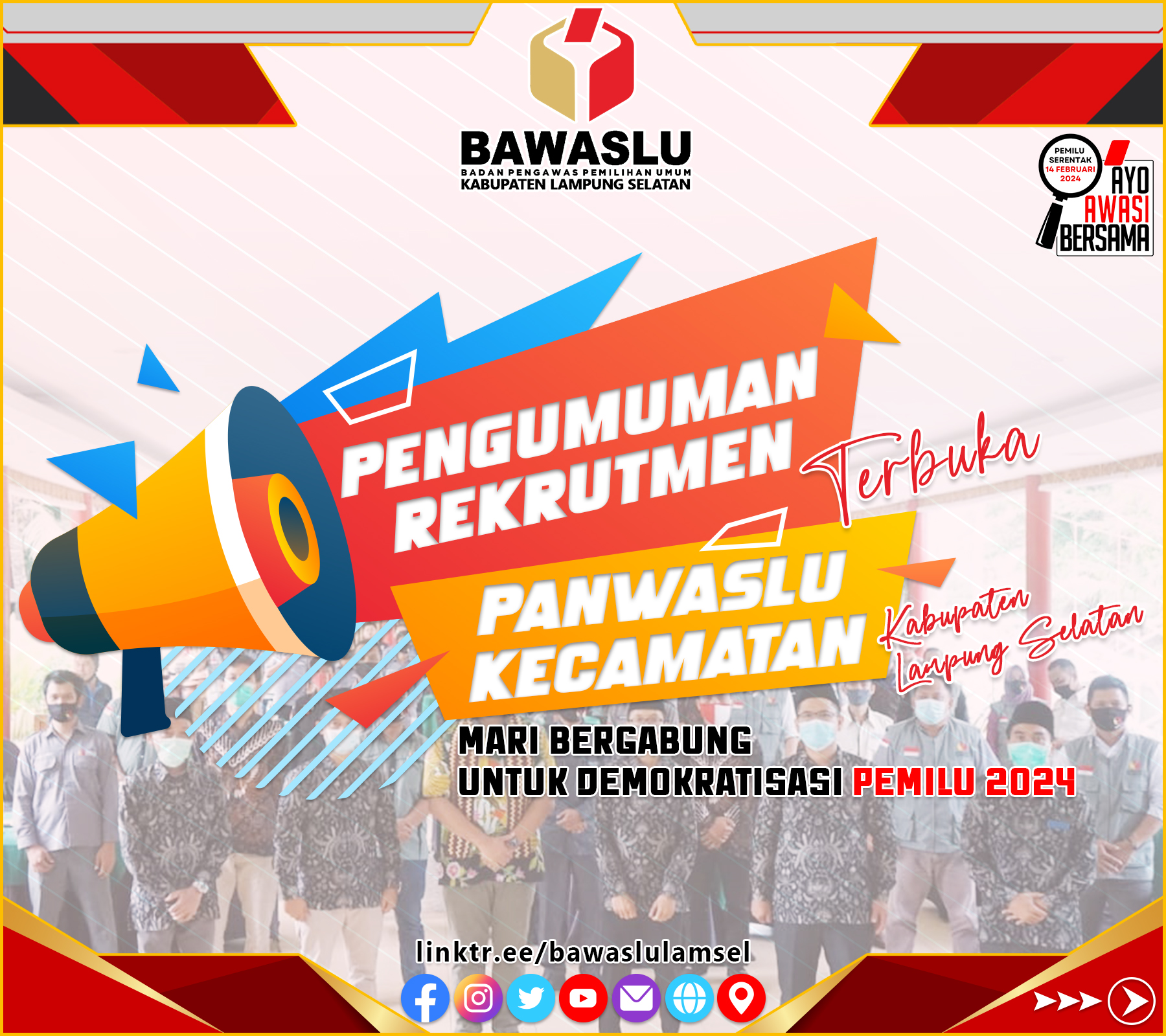 Dalam rangka pembentukan Panwaslu Kecamatan dalam Pemilu serentak tahun 2024, Kelompok Kerja Pembentukan Panwaslu Kecamatan Kabupaten Lampung Selatan berdasarkan Peraturan Badan Pengawas Pemilihan Umum Republik Indonesia Nomor 19 Tahun 2017 sebagaimana telah diubah terakhir dengan Peraturan Badan Pengawas Pemilihan Umum Republik Indonesia Nomor 8 Tahun 2019, atas kewenangan yang diberikan oleh Undang-Undang Nomor 7 Tahun 2017, membuka kesempatan bagi Warga Negara Indonesia yang memenuhi persyaratan untuk mendaftarkan diri sebagai calon anggota Panwaslu Kecamatan.