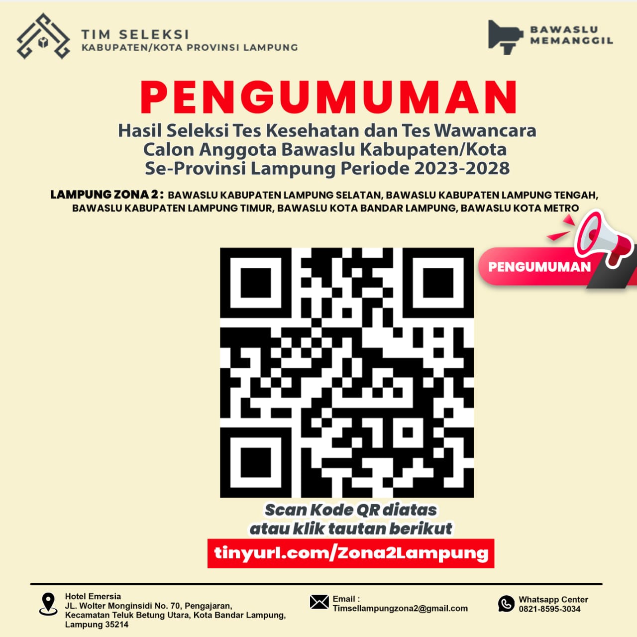 Untuk Pengumuman Resmi dapat di Unduh melalui Scan QR Barcode diatas atau dapat di akses pada Website Resmi Bawaslu Kabupaten/Kota Zona 2 Lampung.