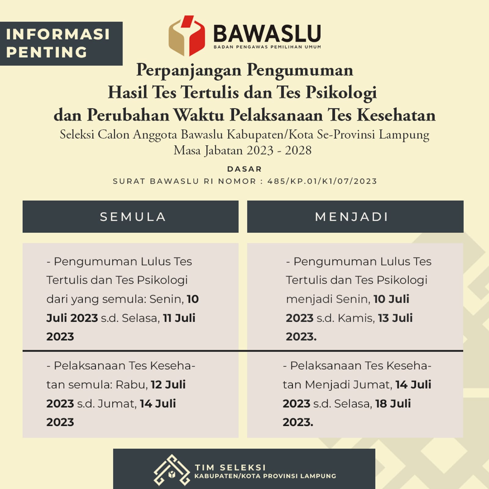 Tentang Perpanjangan Pengumuman Hasil Tes Tertulis dan Tes Psikologi dan Perubahan Waktu Pelaksanaan Tes Kesehatan.