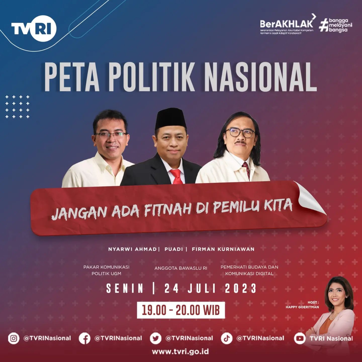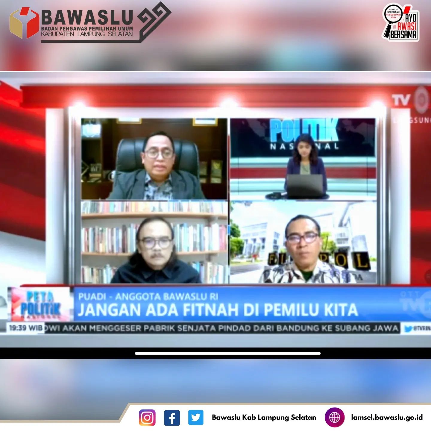 Koordinator Divisi Penanganan Pelanggaran Bawaslu RI , Puadi menjadi pembicara dalam talkshow Peta Politik Nasional “Jangan Ada Fitnah di Pemilu Kita” yang diselenggarakan oleh TVRI pada 24 Juli 2023 Pukul 19.00 WIB.