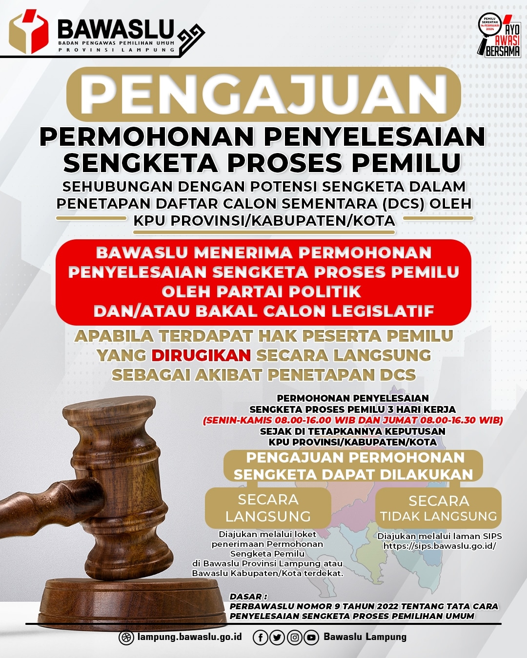 Sementara itu, Permohonan Penyelesaian Sengketa Proses Pemilu dapat diajukan secara langsung atau tidak langsung. Penerimaan permohonan secara langsung diajukan melalui loket penerimaan Permohonan Penyelesaian Sengketa Proses Pemilu di Bawaslu Provinsi Lampung atau Bawaslu Kabupaten/Kota terdekat. Sedangkan penerimaan permohonan secara tidak langsung diajukan melalui laman SIPS.