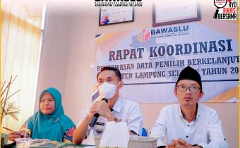 Badan Pengawasan Pemilihan Umum (Bawaslu) Provinsi Lampung adakan Rapat Koordinasi (Rakor) dengan Dinas Kependudukan dan Catatan Sipil (Disdukcapil) dan Komisi Pemilihan Umum (KPU) Lampung Selatan terkait penertiban data pemiih berkelanjutan (DPB) di Kantor Bawaslu Kabupaten Lampung Selatan (Lams
